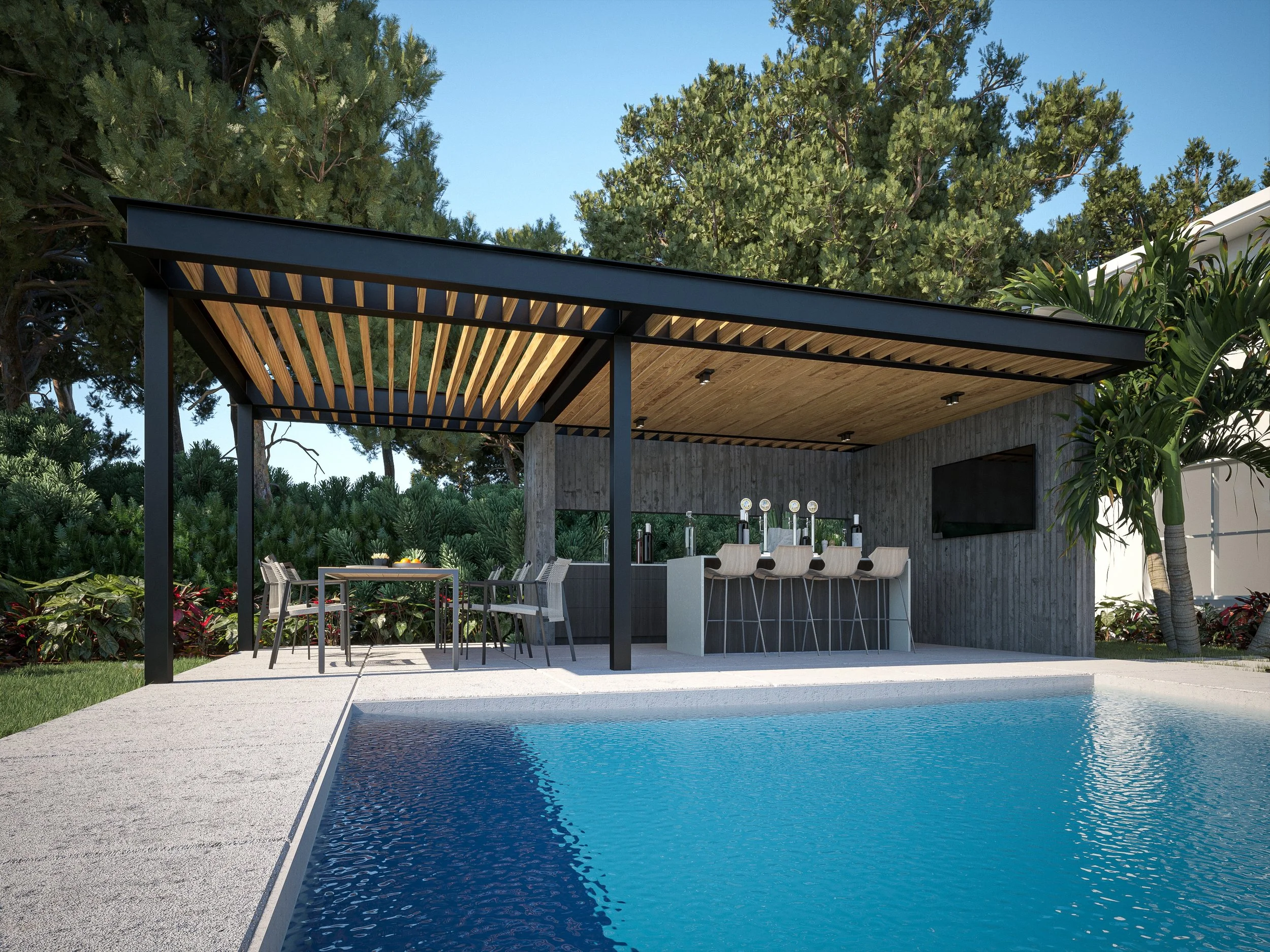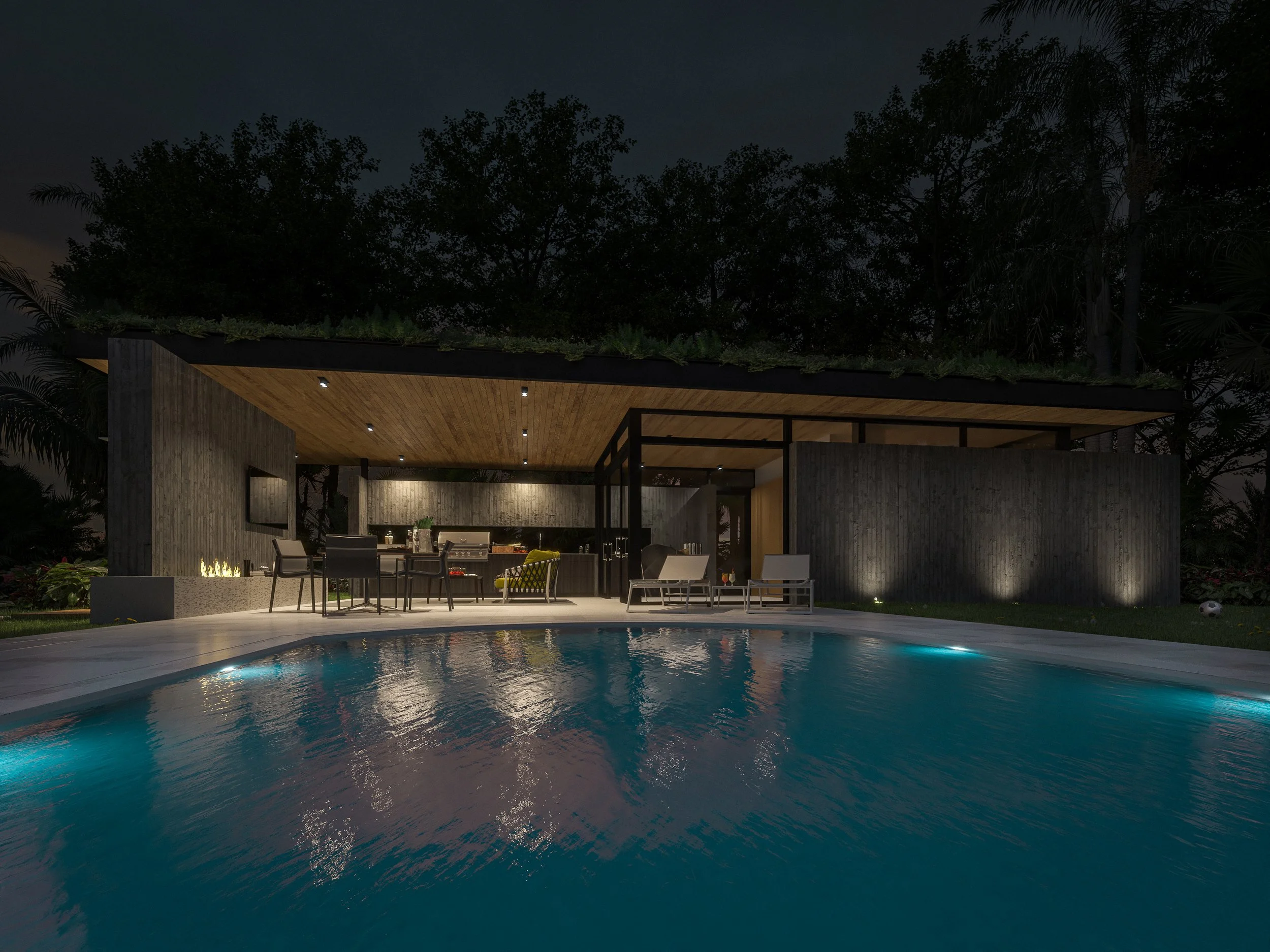 Crafted with simple board-form concrete masses, it features open sitting areas that invite relaxation, an outdoor kitchen for keeping the fun outside, and a guest bedroom that doubles as an office for versatile use. A lush green roof enhances sustainability and the feeling of being immersed in nature, especially from within the pool itself. A complimentary steel pavilion sits on the opposite end of the pool and features wooden ceiling slats that provide shaded elegance.