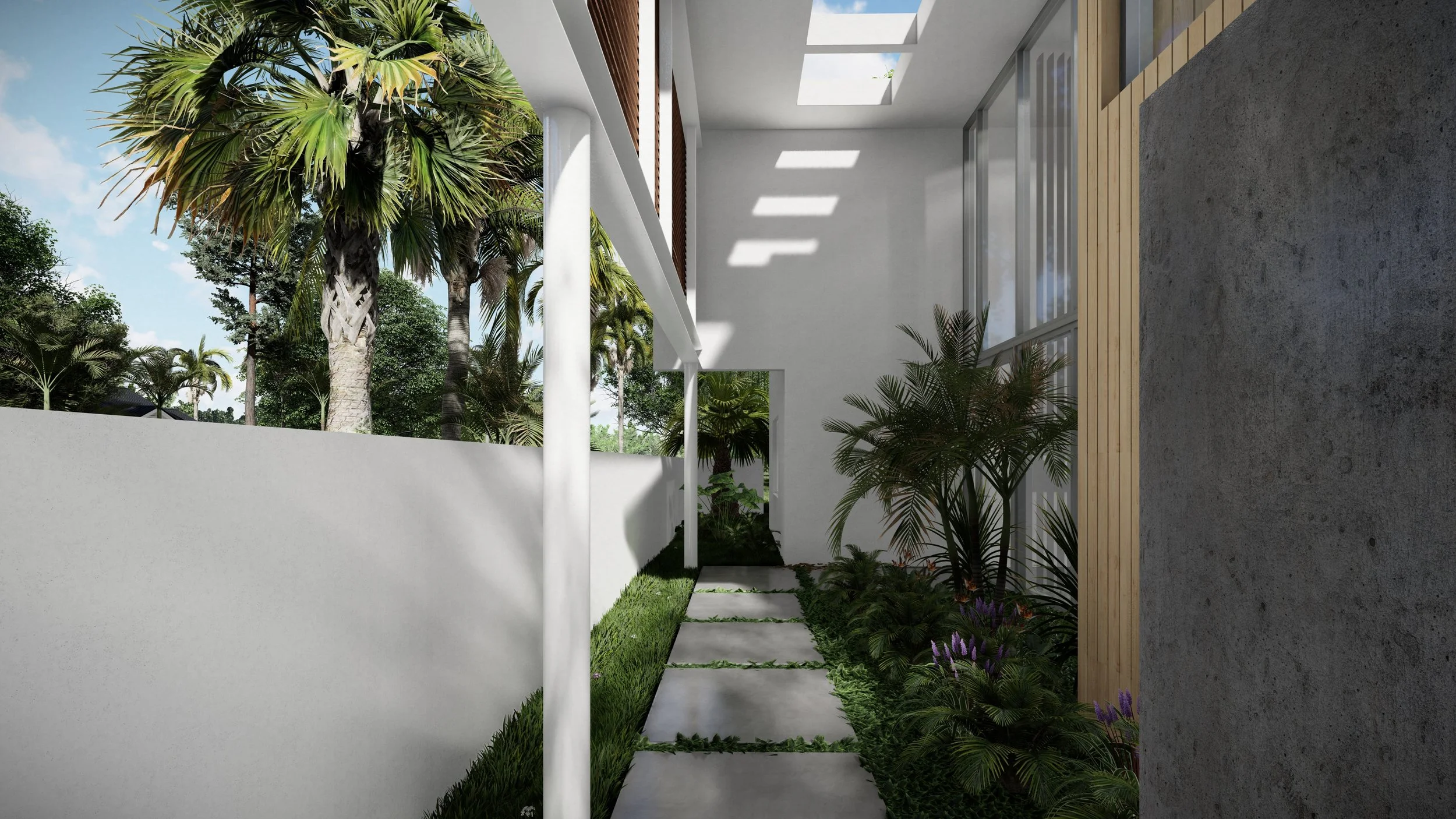 The interior living space has been redesigned to fit the client’s needs. On the first floor, the master bedroom was expanded to accommodate a more efficient layout, including an enlarged bathroom and private study. Large overhangs and a private master bedroom terrace were added to the south facade to protect from the afternoon sun and project views to Sarasota Bay. The existing roofline on the first floor was extended to the east to accommodate the additional space on the first floor, thus adding a new character to the south facade. By using the existing footprint of the house—apart from an enlarged garage—a minimal number of trees were required to be removed or replaced. The site stays undisturbed, creating a sustainable model for renovations in this historic neighborhood.